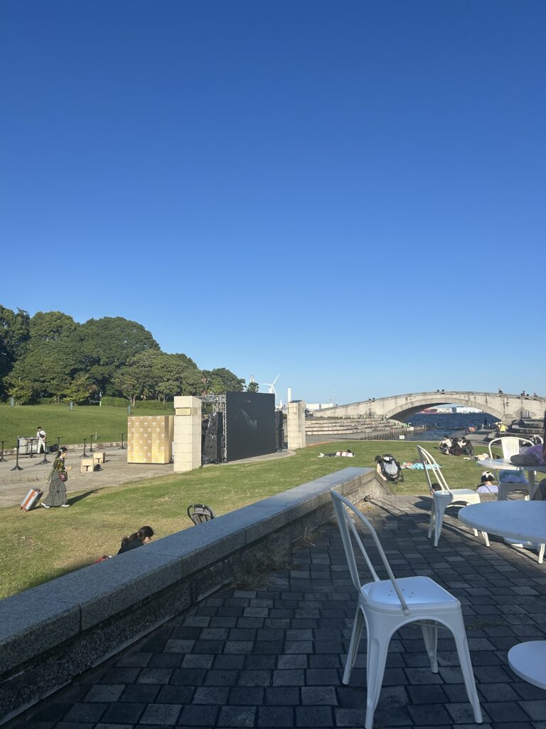 横浜ティンバーワーフの周りは芝生が一面に広がり、自然を感じられ、海も眺められます!