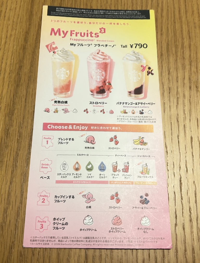 スターバックスオススメのゴールデンパイン&グアバ組み合わせにしました。(2026年1月時点)季節によって選べるものが変わるので、公式のホームページ要チェックです。